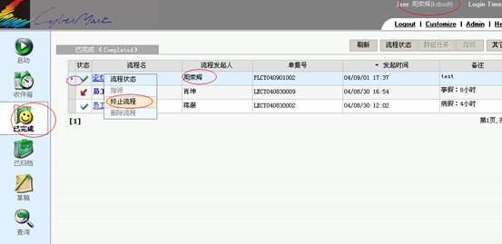 A: 只有发起人才有资格取消自己发起的流程,别人无法取消,在已完成列表中,选择你要取消的流程,右键选择取消 ( 如下图 ) 。